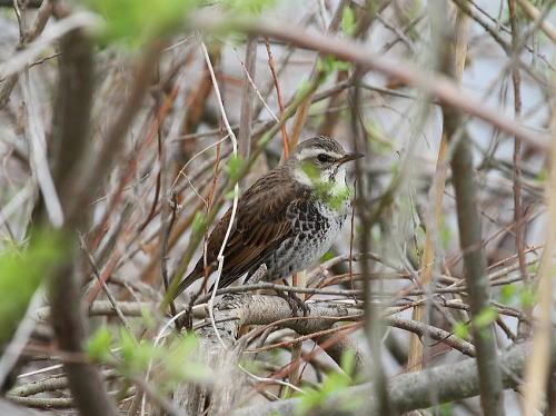 | アオジ[3月12日] 川岸で数羽が採餌していました。 | ツグミ[3月12日] 芽吹き始めた柳の木で休憩中です。 | |