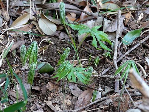 | ヒトリシズカ[3月23日] 咲き揃いました。 | ヒメウズ[3月23日] だいぶ見かけるようになりました。 | |