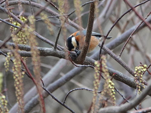 | アカハラ[3月7日] 道路脇の植え込みに隠れていました。 | ヤマガラ[3月7日] 落ちていた実を拾って来てキブシの枝でコツコツと突いていました。 | |