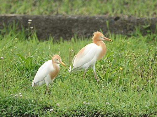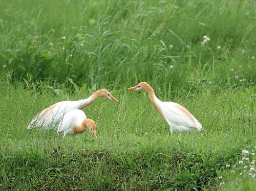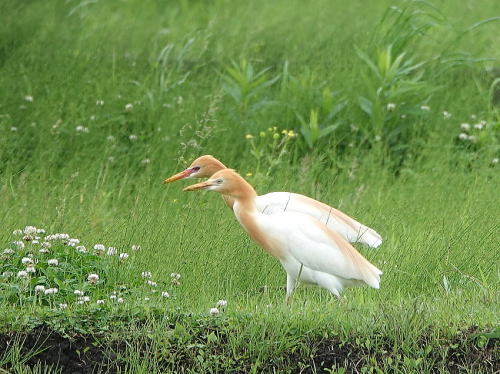 | コサギ[5月31日] 川でサギ類を見かけなくなりました。暫くぶりです。 | アマサギ[5月30日] 1羽は若鳥のようです。 | |