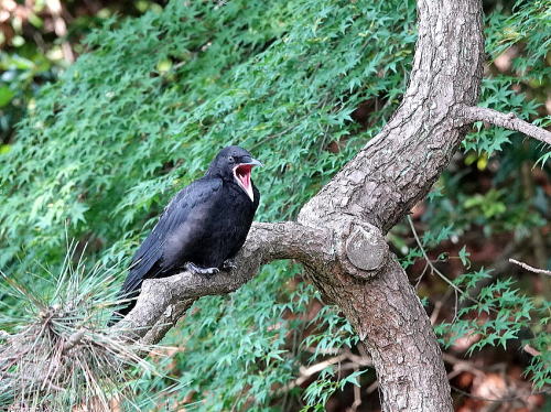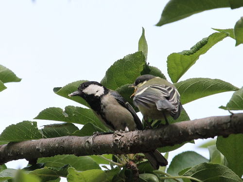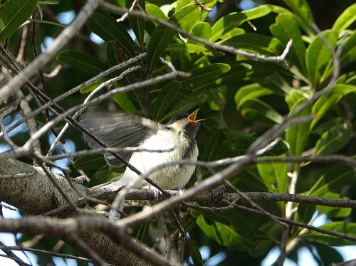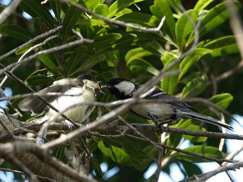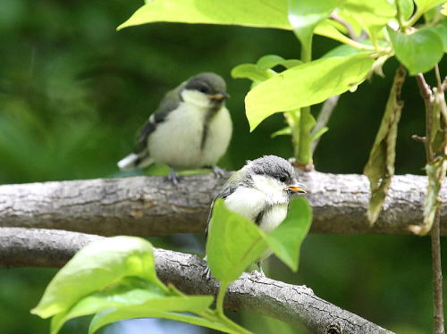| シジュウカラ[5月10日] 幼鳥が何羽も群れていました。 | シジュウカラ[5月10日] 親に餌をねだっています。この後口に入れてもらいました。 | |