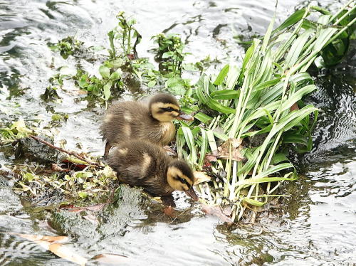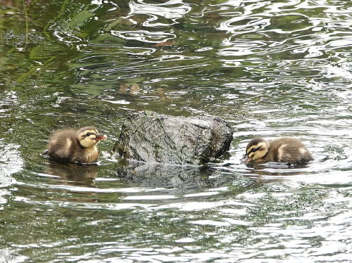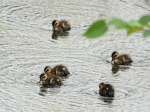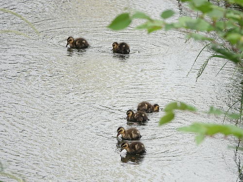 | カルガモ[5月20日] ヒナはいつの間にか5羽になりました。 | カルガモ[5月20日] もう1羽増えて6羽になりましたが、親ともう1羽が見つかりませんでした。 | |