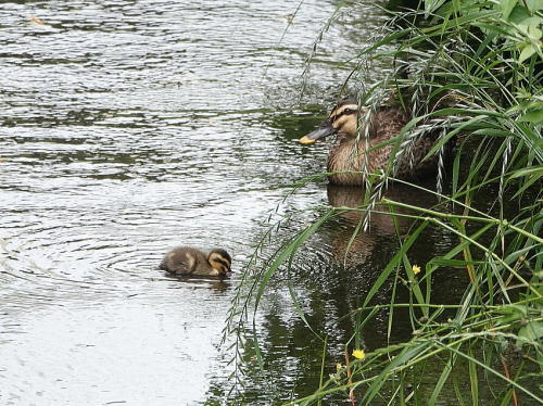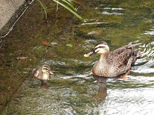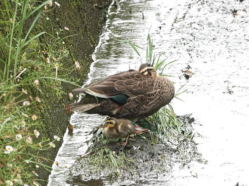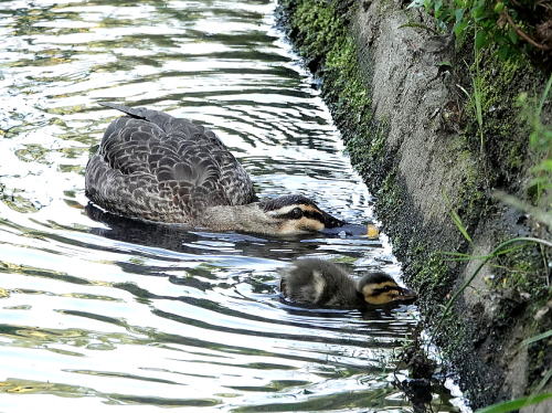 | カルガモ[5月21日] 今朝は昨日のヒナ6羽が見当たらず、親とヒナ1羽だけがいました。 | カルガモ[5月21日] 昨日のヒナ6羽はどこへ行ったのでしょう。この先は暗渠です。 | |