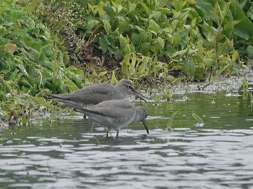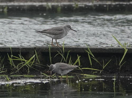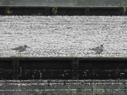 | キアシシギ[5月13日] 夕方、声がして2羽が飛んで来ました。 | キアシシギ[5月13日] 早速田んぼを歩いて採餌しています。 | |