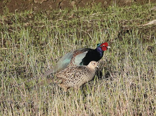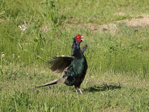 | キジ[5月2日] 一緒に採餌していました。 | キジ[5月2日] お腹いっぱいになった♀をおいて、縄張り宣言の母衣打ちです。 | |