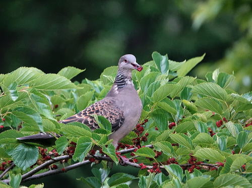 | キビタキ[5月10日] 帰りがけに少し離れた所で見掛けました。上と同一個体かは分かりません。 | キジバト[5月8日] ヤマグワの実を食べていました。 | |