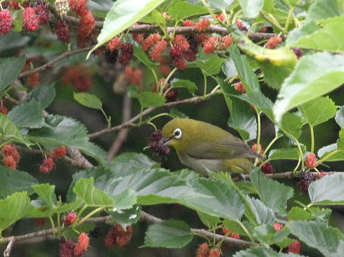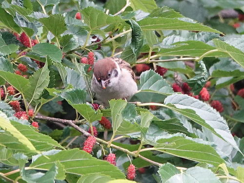 | メジロ[5月22日] 美味しそうな桑の実が沢山なっています。メジロが食べにやって来ました。 | スズメ[5月22日] スズメも来てパクパク食べています。 | |