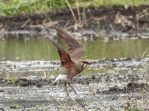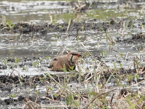 | ツバメチドリ[5月12日] 居るよと教えていただきました。着いたばかりでしょうか、ムクドリの群れに居ました。 | ツバメチドリ[5月12日] 水浴びを始めました。 | |