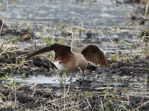 | ツバメチドリ[5月12日] 水浴びが終わっての羽ばたきです。 | ツバメチドリ[5月12日] エサも獲ります。 | |