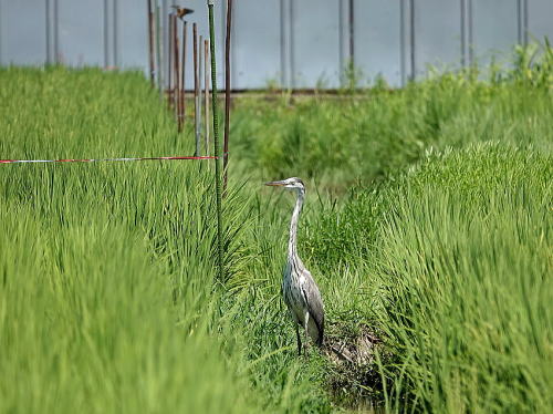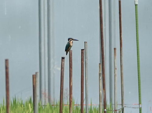| アオサギ[8月1日] 田んぼの畦にアオサギが居ました。奥の棒の上に鳥影が。 | カワセミ[8月1日] 棒の上に止まっていたのはカワセミです。用水路の魚を狙っています。 | |