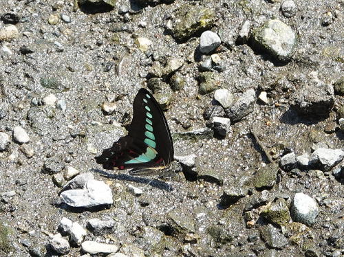 | オオバン[8月1日] 他に川に居たのはカルガモ1羽とスズメだけでした。 | アオスジアゲハ[8月1日] あまりの暑さに蝶も河原で吸水です。 |