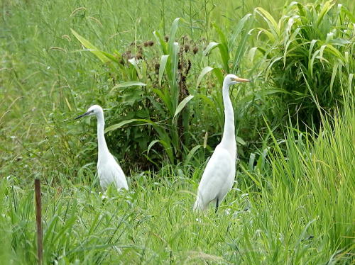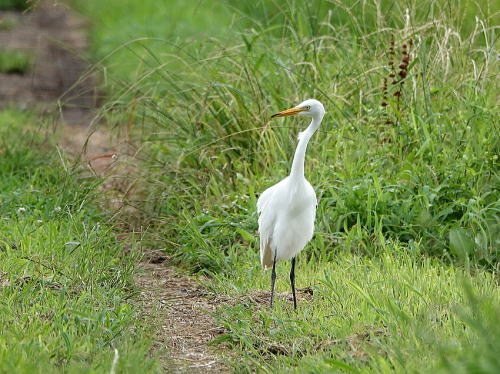 | チュウサギ[8月8日] 午後に田んぼに行ってみました。農道に3羽いました。 | チュウサギ[8月8日] 1羽は直ぐに飛んでしまいました。どちらもチュウサギだと思います。 | |