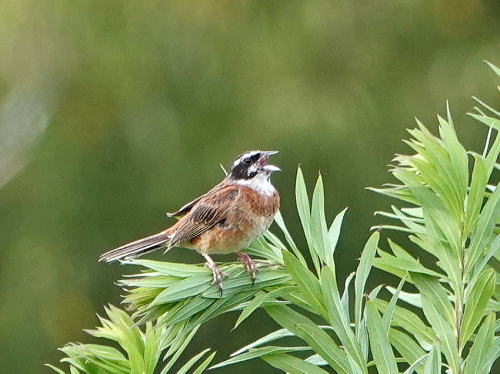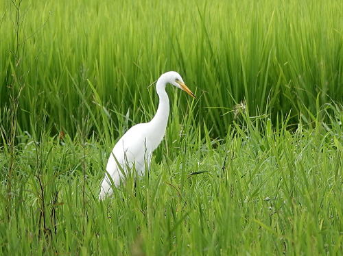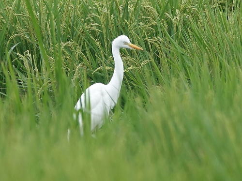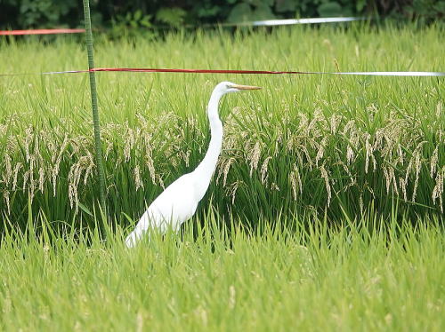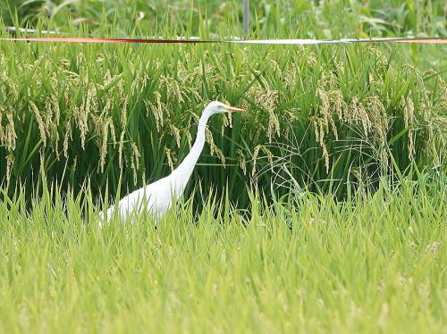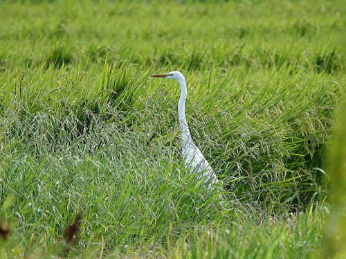 | ホオジロ[8月20日] 風に揺られながらも囀っていました。 | ダイサギ[8月17日] 田んぼの中に入っても首から上が出ていました。 | |
