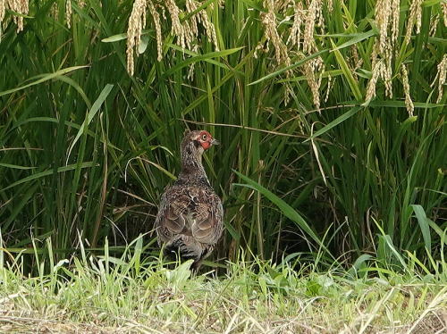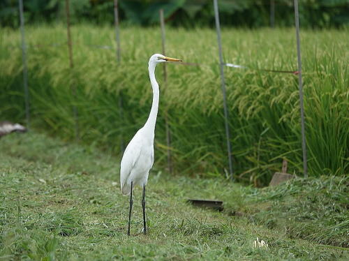| キジ[8月31日] 若♂です。直ぐに田んぼの中に入って行ってしまいました。 | チュウサギ[8月31日] 1羽だけで畦道を歩いていきました。 | |