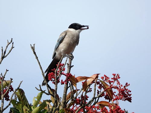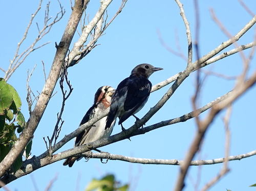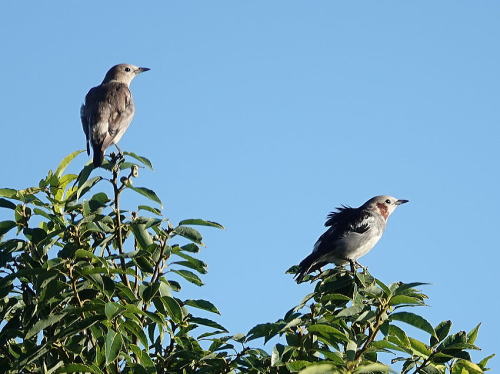 | コムクドリ、ヒヨドリ[8月20日] 先日とは違う木に止まっていました。ヒヨドリの幼鳥も一緒です。 | コムクドリ[8月20日] 一度ここに集まってから10羽づつくらいで塒に飛んで行くようです。 | |