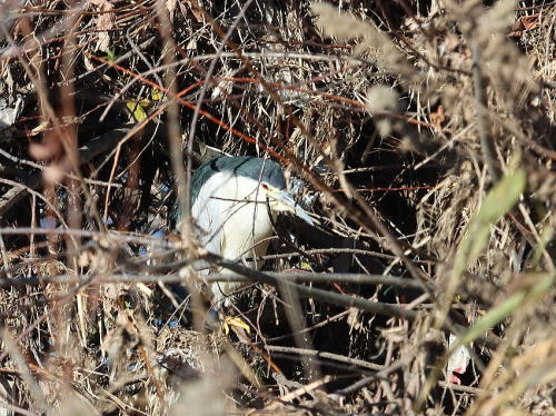 | カイツブリ[12月18日] 離れた場所にそれぞれ1羽づついました。 | ゴイサギ[12月18日] どの角度から撮っても、もじゃもじゃの中です。 | |
