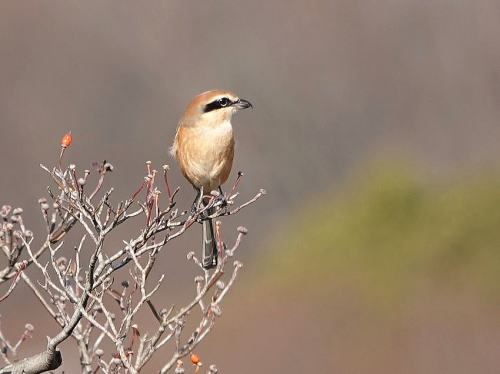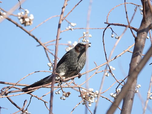 | モズ[12月16日] 寒くなったので獲物探しも大変でしょう。 | シジュウカラ[12月16日] ナンキンハゼが何本もあります。実を脚で押さえて突いて食べていました。 | |