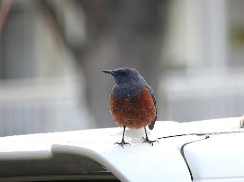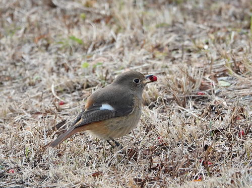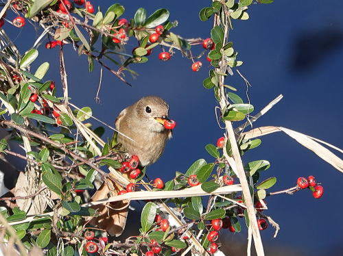 | イソヒヨドリ[12月26日] ふと見ると駐車場の車の上に止まっていました。 | ジョウビタキ[12月26日] 実がいっぱいのピラカンサの木の下です。 | |