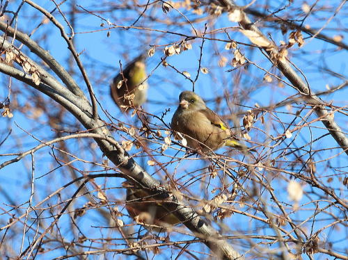 | ノスリ[12月28日] 今シーズンもいつもの定位置に帰って来てくれました。 | カワラヒワ[12月28日] 群れで来てアキニレの木の実を食べています。 | |