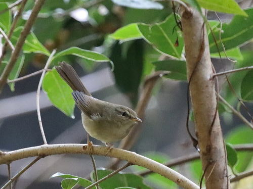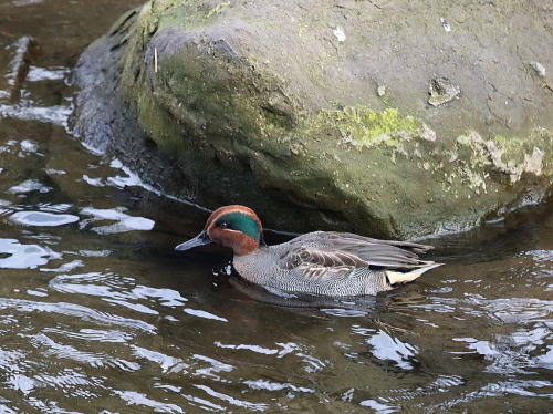 | コガモ[12月12日] 1羽だけで採餌中でした。 | ウグイス[12月12日] やっと繁みから姿を見せてくれました。 | |