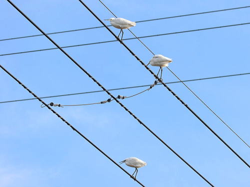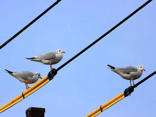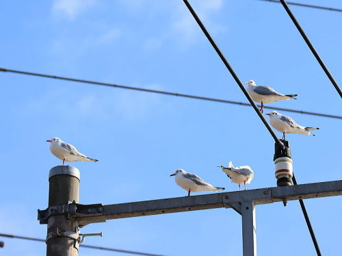 | ムラサキツバメ[12月10日] こんな所でと教えていただきました。20頭以上の越冬集団です。 | ユリカモメ[12月10日] 往きには1羽のみ、帰りには4羽見かけました。 | |