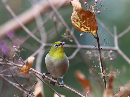 | メジロ[12月16日] 足で掴んで齧っているようでした。 | ヒヨドリ[12月16日] パクッと一飲みです。 | |