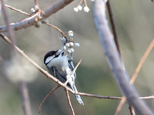 | コサギ[12月10日] 遠くから見た時は何がいるのだろうと思いました。 | ヤマガラ[12月10日] 近くから何度も何かの実を取ってきて突いて食べていました。 | |
