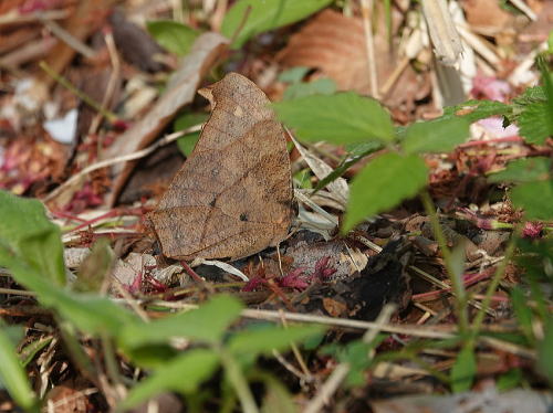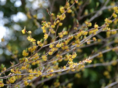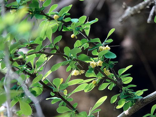 | クロコノマチョウ[4月16日] 地面に下りると落ち葉と見分けがつかなくなります。 | メギ[4月16日] 小さな花が咲いていました。 | |