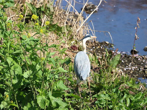 | バン[4月9日] 2羽とも夏羽でした、番でしょうか。 | アオサギ[4月9日] 餌場を探しているようでした。 | |