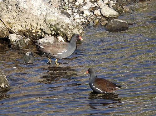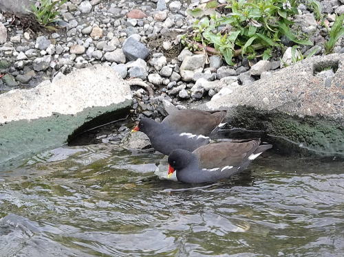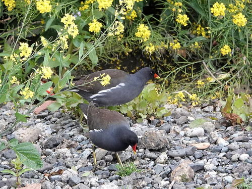 | カワウ[4月17日] 若鳥のようです。 | バン[4月17日] 2羽で一緒にいるのをよく見かけます。 | |