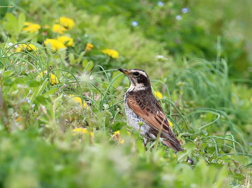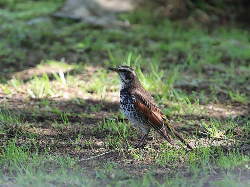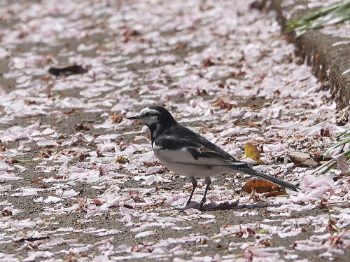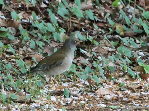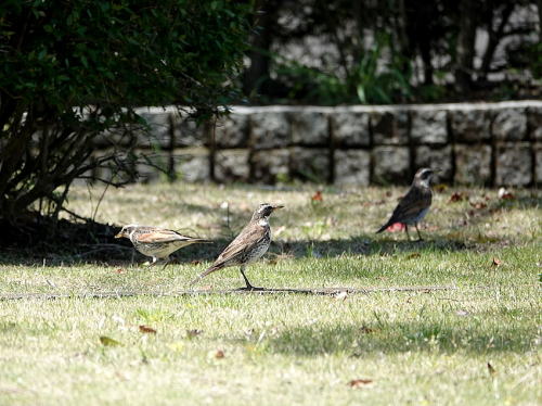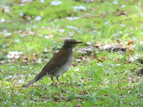 | ハクセキレイ[4月22日] 八重桜の花びらに溶け込んでいます。 | ツグミ[4月22日] 10羽くらいの群れで飛んで来て広場に下りました。 | |