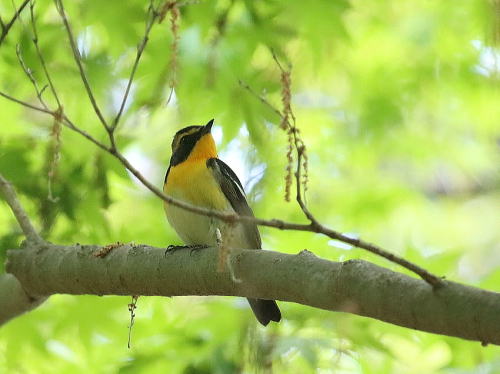 | キビタキ[4月22日] 若葉に付いている青虫を探しています。 | キビタキ[4月22日] さっと飛んで虫を獲り直ぐに食べてしまいました。 | |