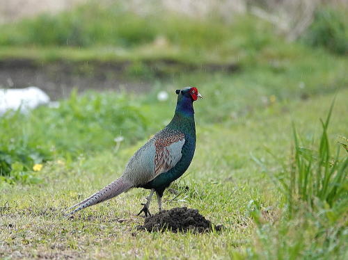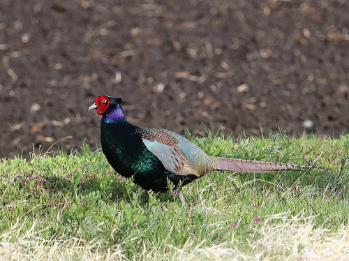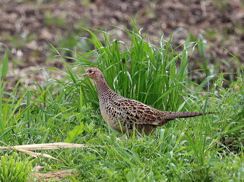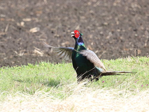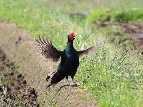 | キジ[4月1日] ♂1羽だけで歩いていました。 | キジ[4月1日] 一度だけ母衣打ちをしました。 |