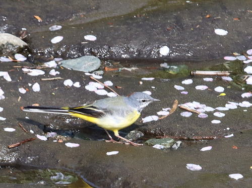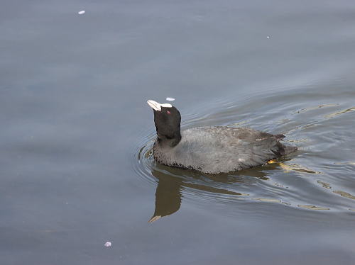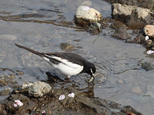 | セグロセキレイ[4月1日] 見事、小魚を獲りました。 | オオバン[4月1日] 流れてくる桜の花びらを食べたり、水を飲んだりしています。 | |