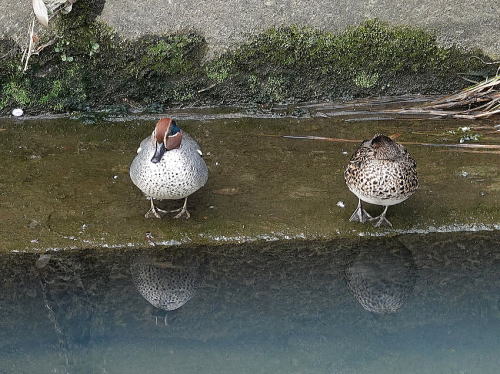 | シジュウカラ[4月2日] 花の付いている枝に止まって欲しかった。 | コガモ[4月2日] 30羽ほど居るよと教えていただきました。 | |