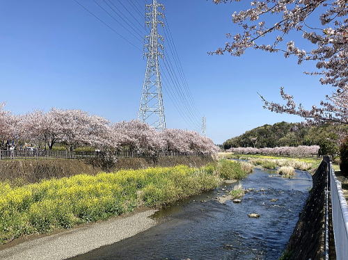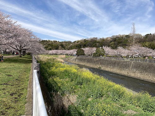 | 桜並木、菜の花[4月1日] 河原には菜の花が咲いています。 | 桜並木[4月1日] 左岸の桜です。 | |