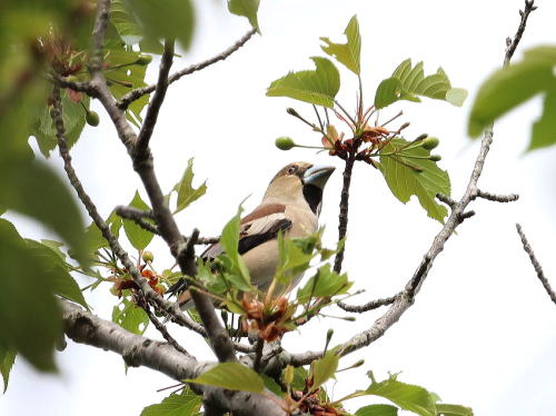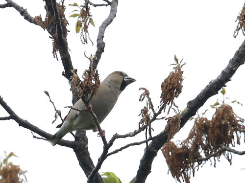 | シメ[4月18日] 群れで高い木の上を飛び交っていました。 | シメ[4月18日] 10羽くらいの群れでした。 | |