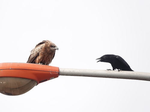| アブラチャン[4月2日] 小さな目立たない花ですが陽が射すと輝いて見えます。 | トビ、ハシボソガラス[4月2日] カラスの縄張りなのでしょうか。 | |