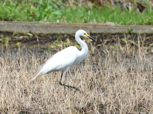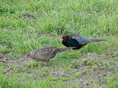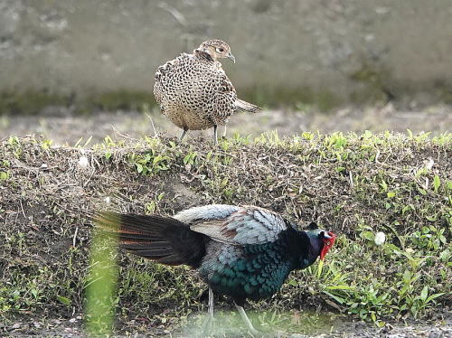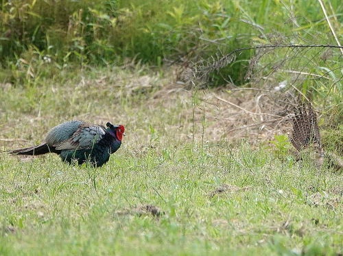 | チュウサギ[5月18日] 1羽だけですが田んぼで採餌していました。 | キジ[5月18日] 先日(6日)♀に振られた♂ですが、今日は一緒に畦を歩いていました。 | |