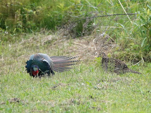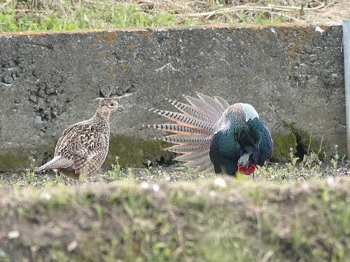 | キジ[5月6日] さあチャンスだ、猛烈にアピールを始めました。 | キジ[5月6日] 尾羽を広げ毛を立てて普段は見ない姿をします。 | |