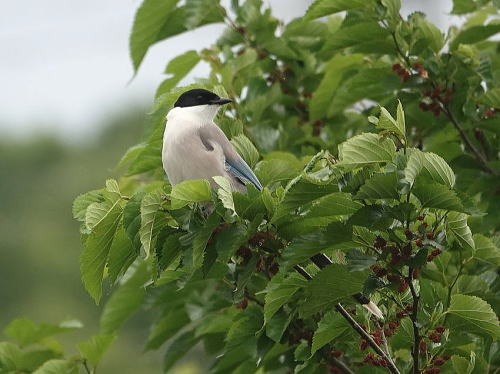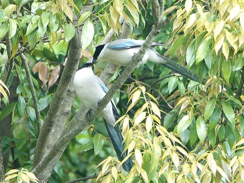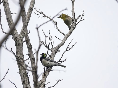 | シジュウカラ、メジロ[5月6日] 餌を持ったシジュウカラにメジロが近づいてきました。 | オナガ[5月6日] 求愛給餌でしょうか。 | |