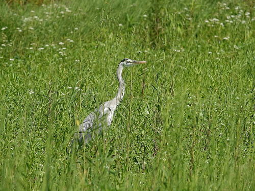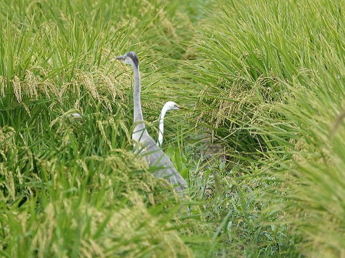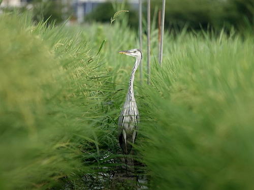 | カワセミ[8月11日] 幼鳥です。 | アオサギ[8月11日] 稲にいるバッタを探しているようです | |