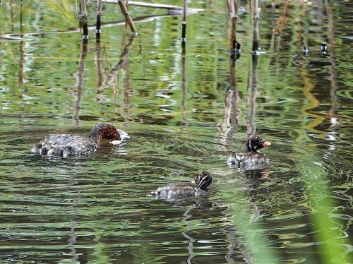 | カイツブリ[8月12日] 近所の公園にカイツブリの親子がいました。餌を獲って貰っています。 | カイツブリ[8月12日] 雛は3羽いました。 | |