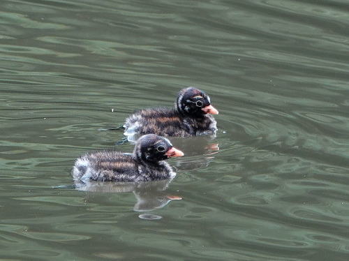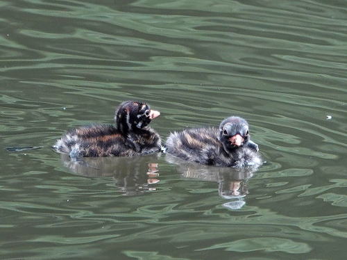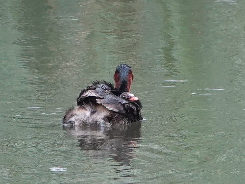 | カイツブリ[8月12日] 2羽は満腹した様子です。 | カイツブリ[8月12日] 雛1羽は遊覧船です。 | |