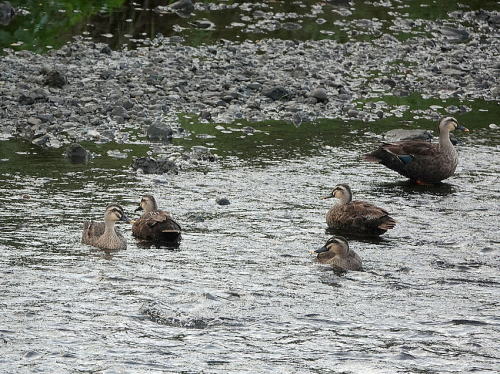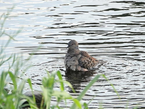 | カルガモ[8月8日] 右奥に居るのが親、あとの4羽は幼鳥でしょうか。 | キジバト[8月8日] 長い間気持ちよさそうに浸かっていました。 | |