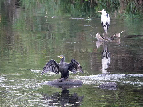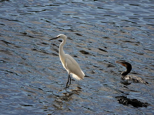| カワウ、アオサギ[8月11日] カワウがこれからの漁に向けて羽を乾かしています。 | コサギ、カワウ[8月11日] カワウは潜って獲るので効率が良さそうです。 | |