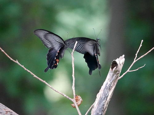 | クロバネツリアブ[8月28日] 近くのツルボには止まってくれません。 | クロアゲハ[8月28日] クロアゲハだと思うのですが、縄張り争いをしている風でした。 | |