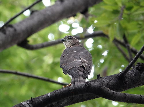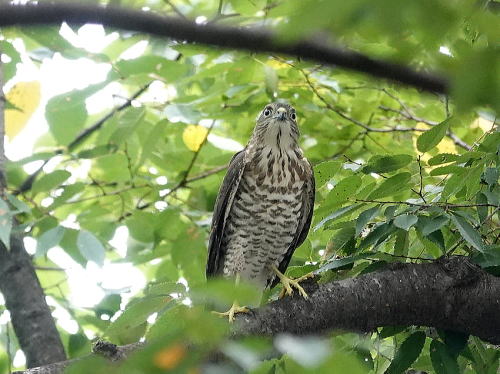 | ツミ[8月14日] 先日巣立った幼鳥です。 | ツミ[8月14日] カラスを追いかけたりしていました。3羽確認できました。 | |