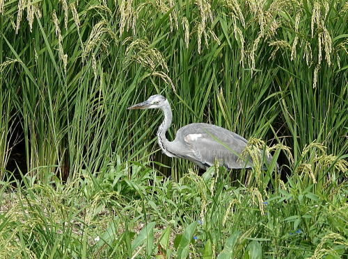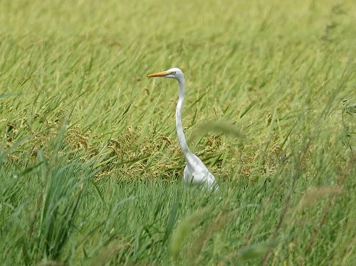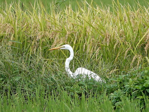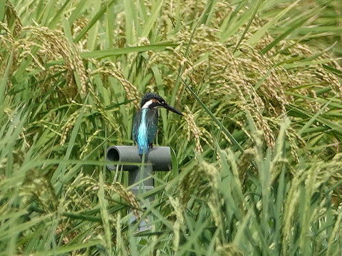 | カワセミ[9月1日] 巣立ったばかりの幼鳥のようです。田んぼの用水路で練習でしょう。 | ダイサギ[9月1日] 未だ1羽だけです。 | |