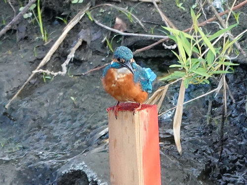 | キカラスウリ[9月17日] 一度ツルツルに刈られていました。 | カワセミ[9月17日] 念入りに羽繕いしていました。 | |